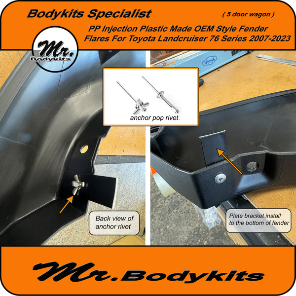 Vehicles without factory flares will need to be fitted using brackets, screws, and adhesive—similar to how genuine OEM flares are installed. Since there are no factory clip holes, this is essential for proper mounting. Still, it's much easier than working with fiberglass or rigid ABS flares.