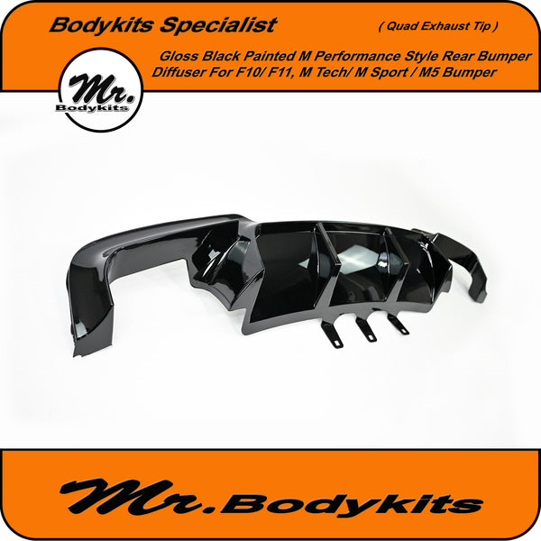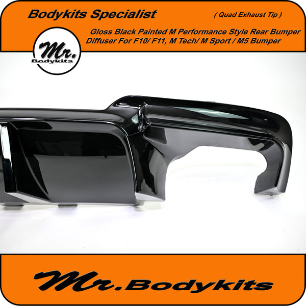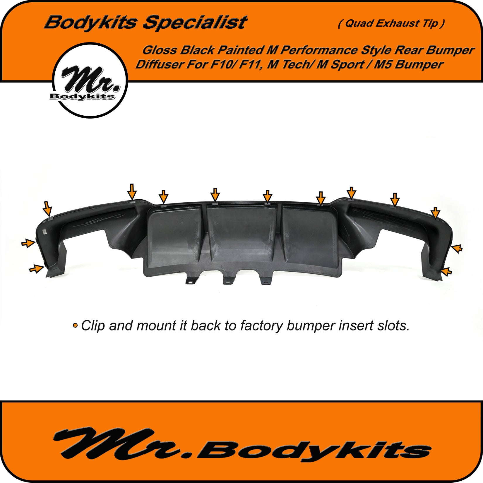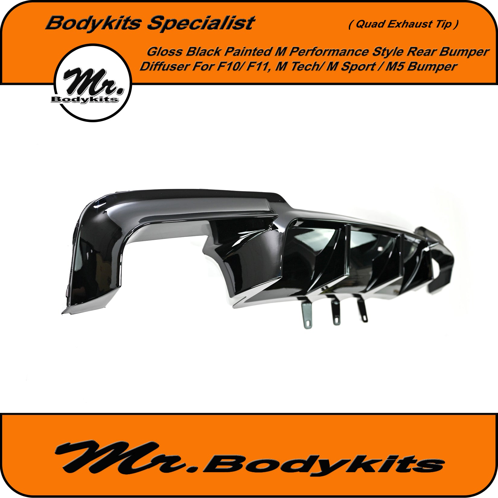 Brand new Mr plastic made gloss black M-Performance style rear bumper diffuser lip with dual exhaust outlet for BMW 5 Series 2010-2016 F10 / F11 sedan and wagon ( fits M-Tech M Sport and M5 factory bumper only )