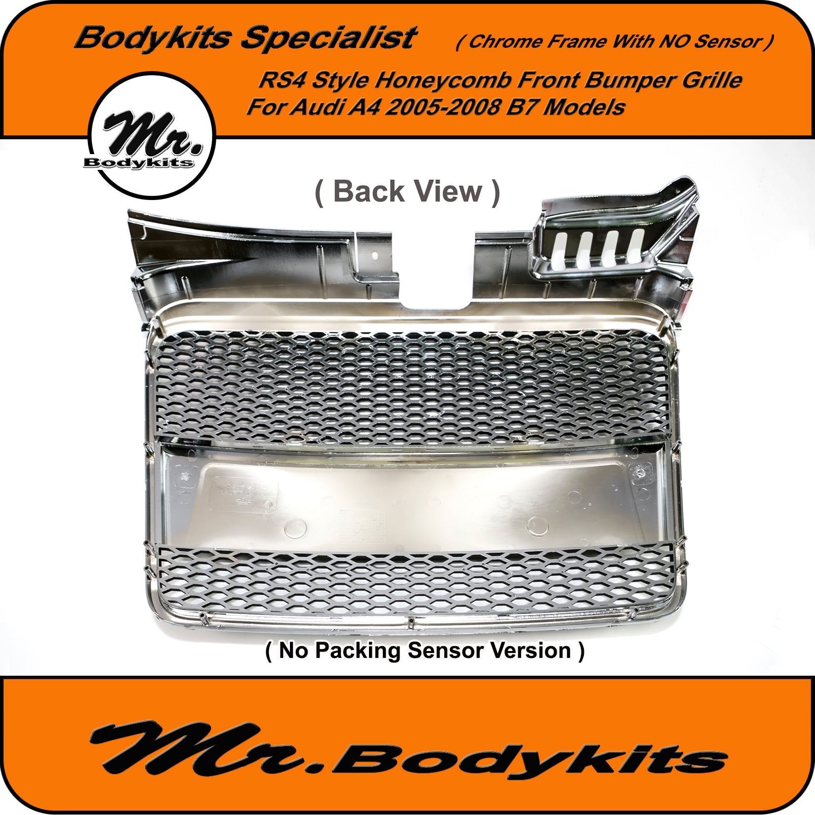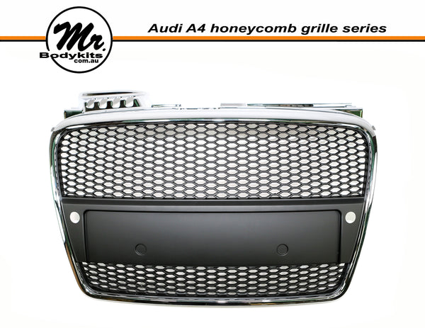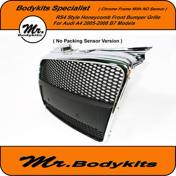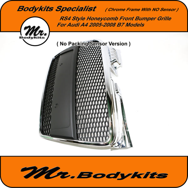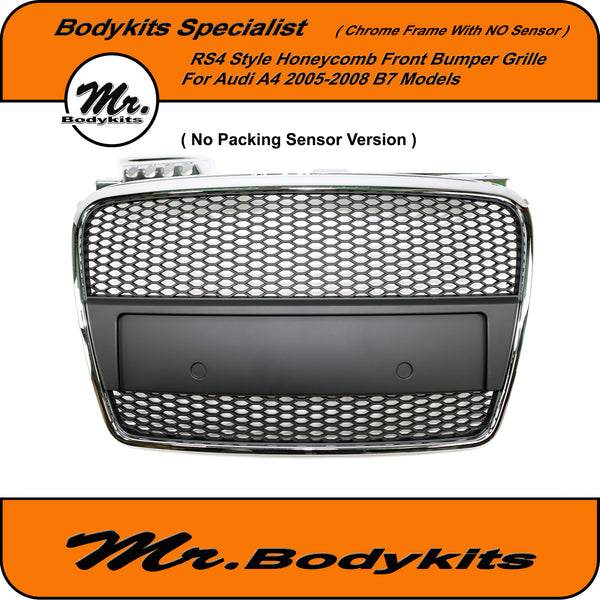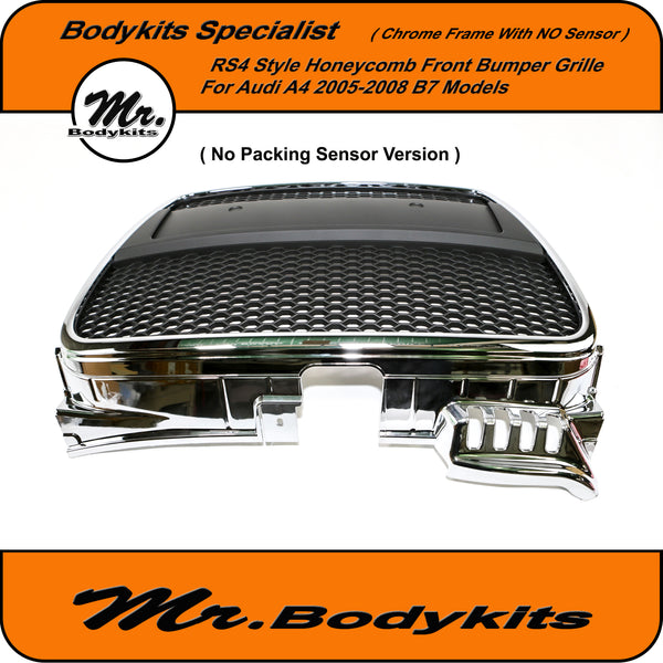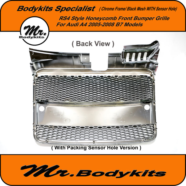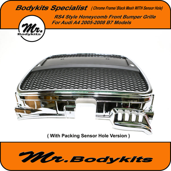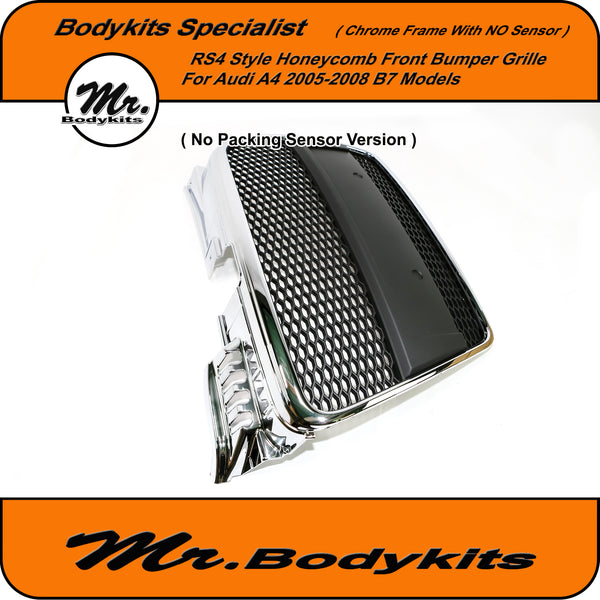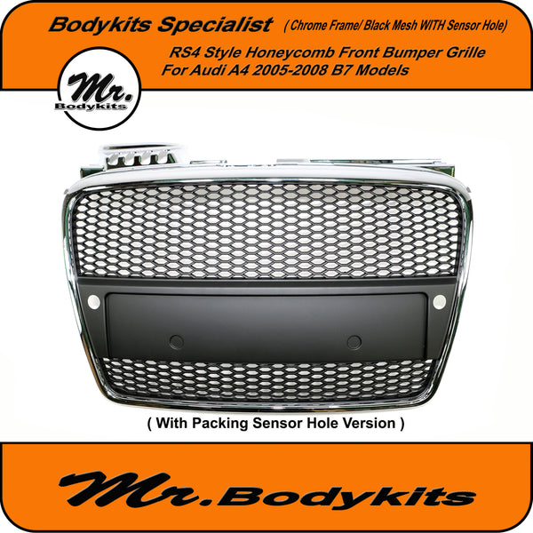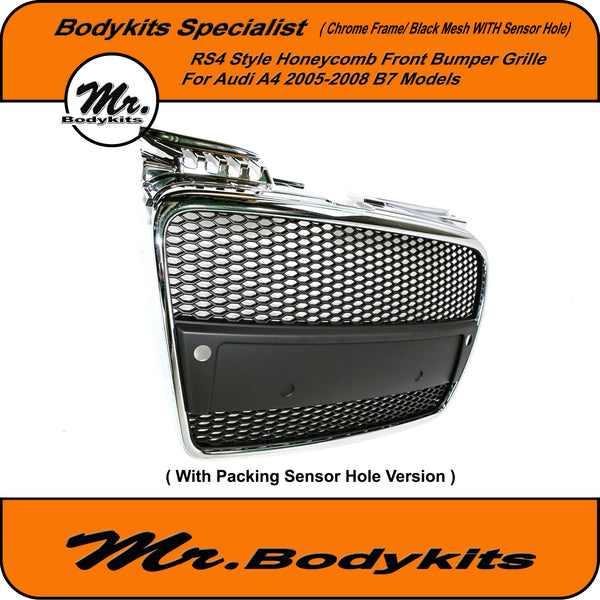 RS4 Style Front Bumper Grille, Chrome Surround Honeycomb Mesh For Audi A4 B7 2005-2008. ( With Or Without Parking Sensor Hole, Please Choose the right one on the option box before checking out )
