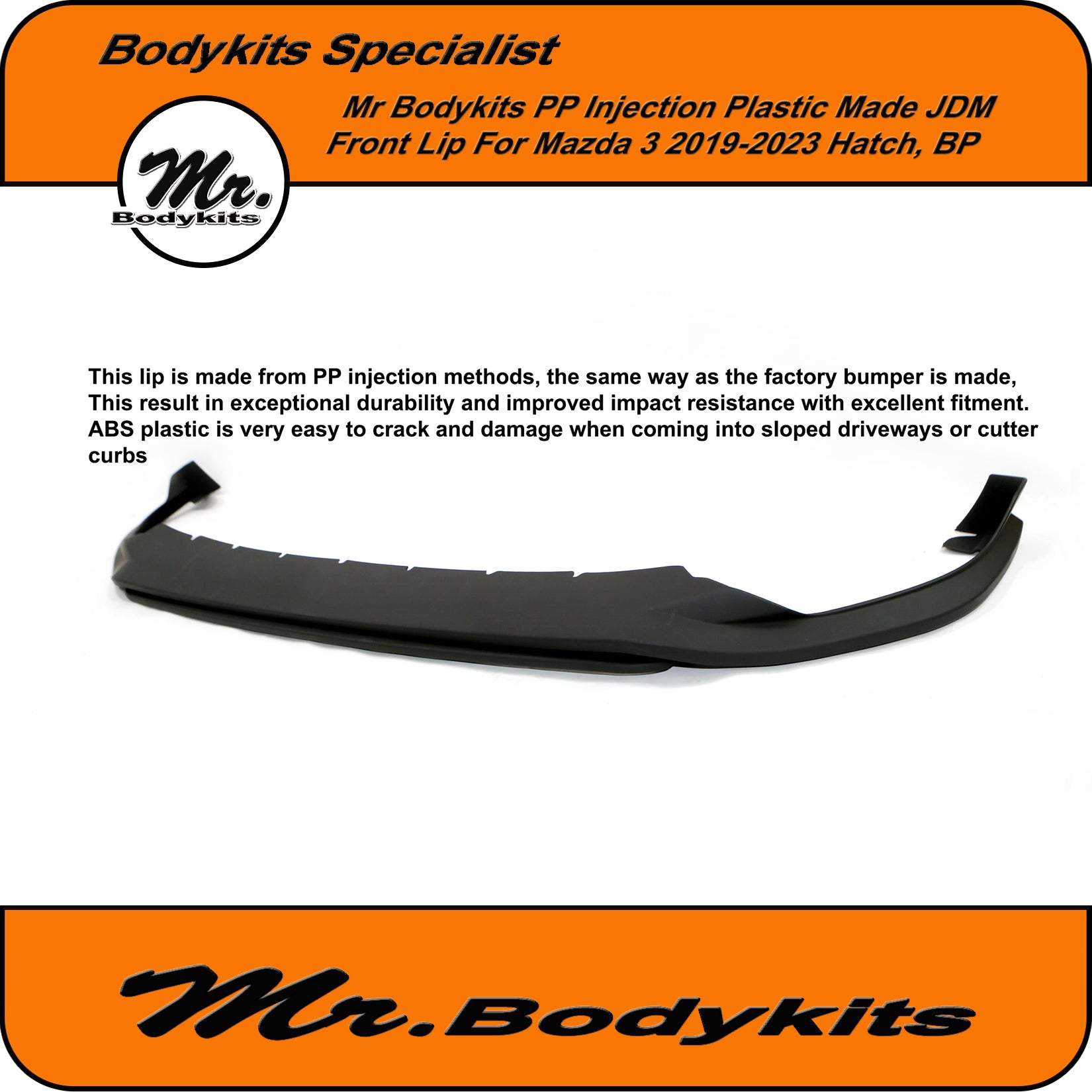 - This lip is made from PP injection methods, the same way as the factory bumper is made, This result in exceptional durability and improved impact resistance with excellent fitment. ABS plastic is very easy to crack and damage when coming into sloped driveways or cutter curbs.