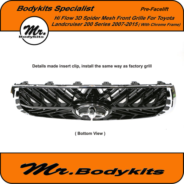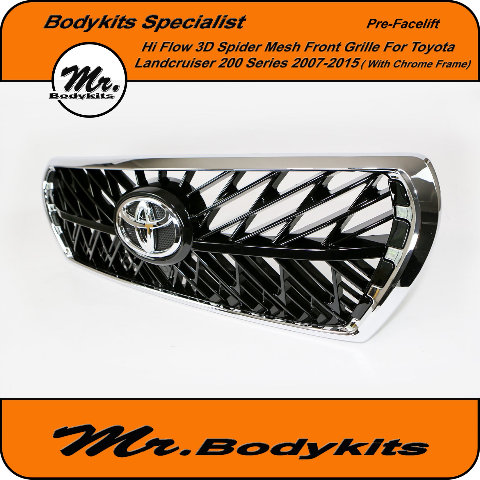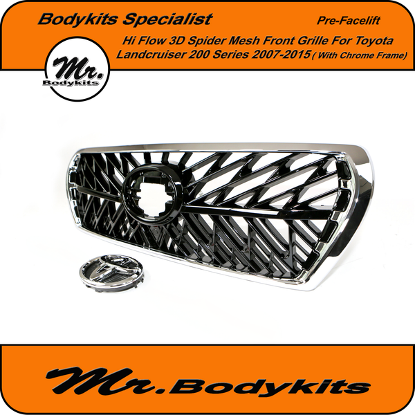 Quality plastic made 3D spider mesh replacement front grille for 2007-2015 Toyota Landcruiser pre-facelift series. (gloss black mesh & chrome surround frame)