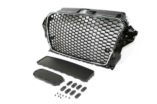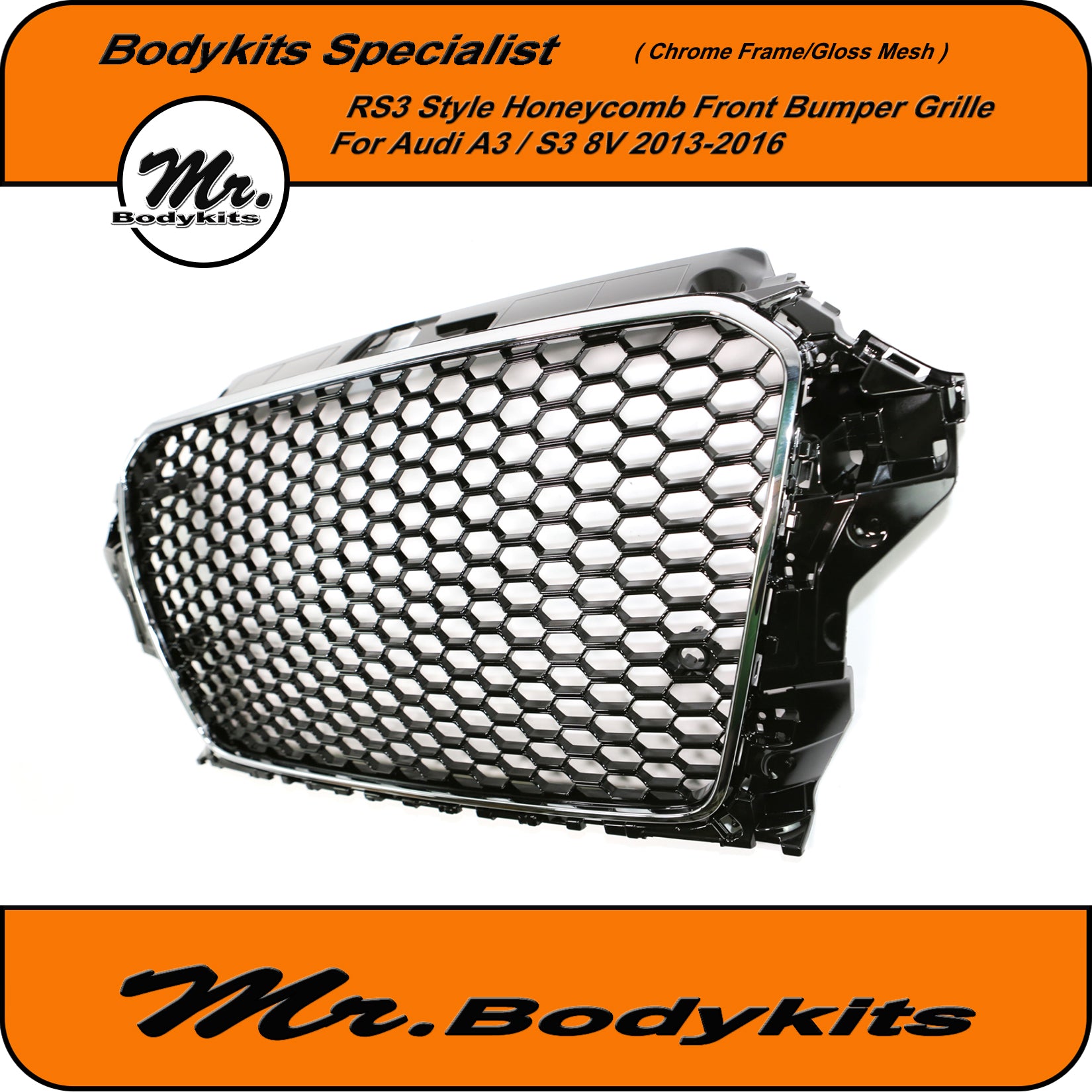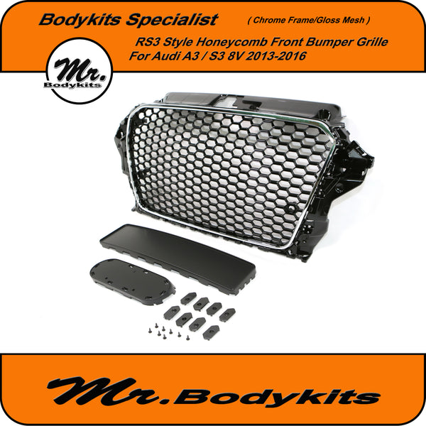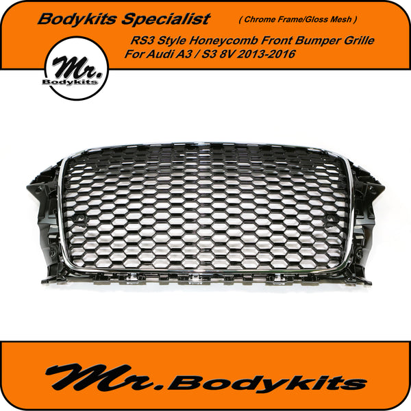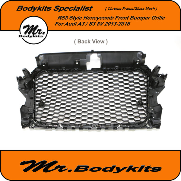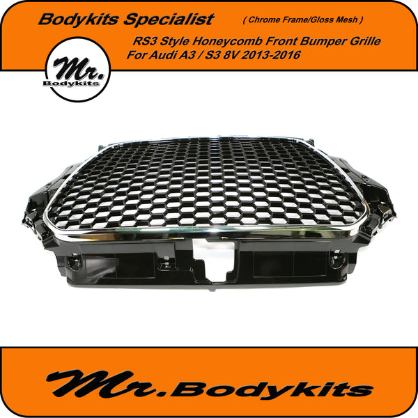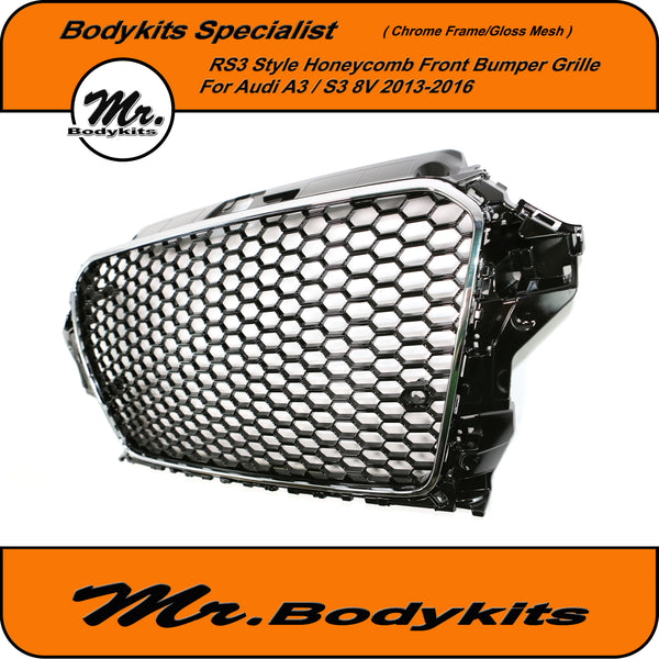 RS3 Style Front Bumper Grille, Chrome Frame Surround With Gloss Honeycomb Mesh Grille For Audi A3/S3 2013-2016 8V with parking sensor holes