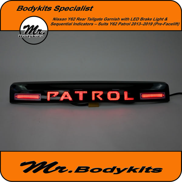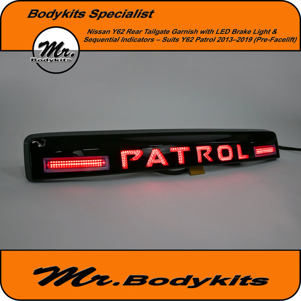 Gloss Black LED Tailgate Garnish Panel – Nissan Patrol Y62 (2013–2019)