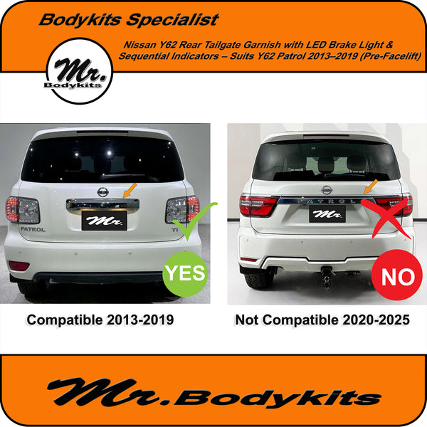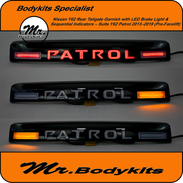 Give your Nissan Patrol Y62 a sleek and modern rear-end upgrade with this full replacement LED tailgate garnish panel. Designed specifically for the 2013–2019 Y62 series, this gloss black panel adds bold styling while integrating advanced lighting features.
