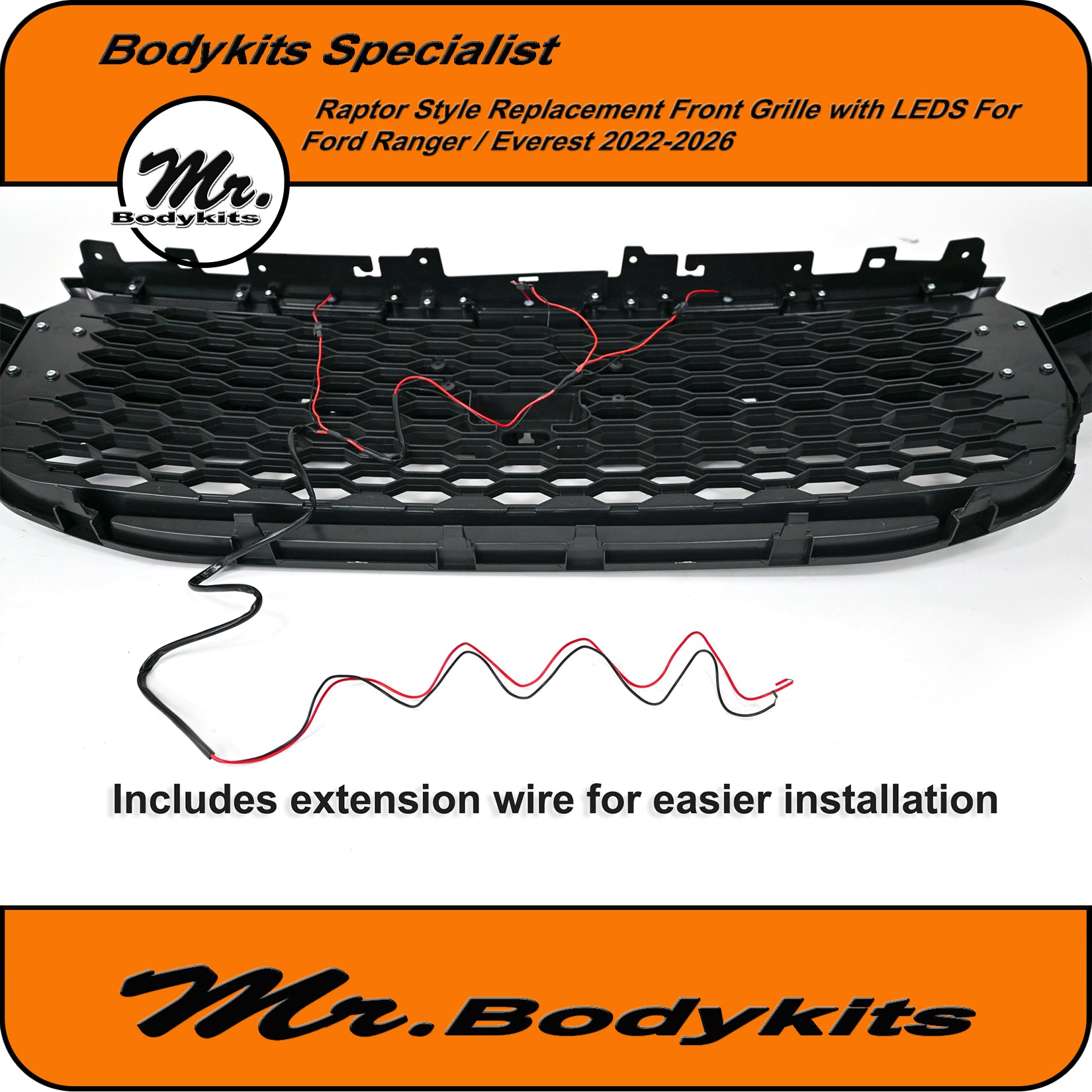 Crafted from injection-moulded ABS plastic, the grille features a sleek matte finish and comes equipped with a Raptor-style badge and three integrated LED lights. An included extension wiring harness allows for flexible installation—run all three lights or just one, depending on your preference.