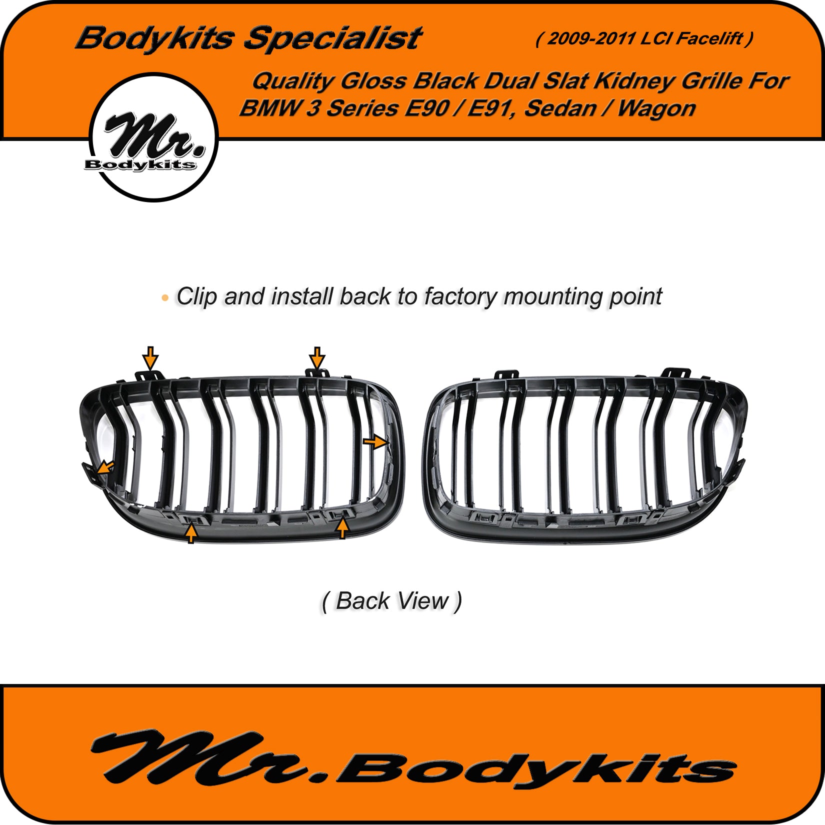 Suits BMW 3 series E90 sedan and wagon ~ 318i, 320i, 320d, 320CI, 323i, 325CI, 328I, 330CI, 330I. Fits all factory bumper (Pre LCI 2009-2011 models)