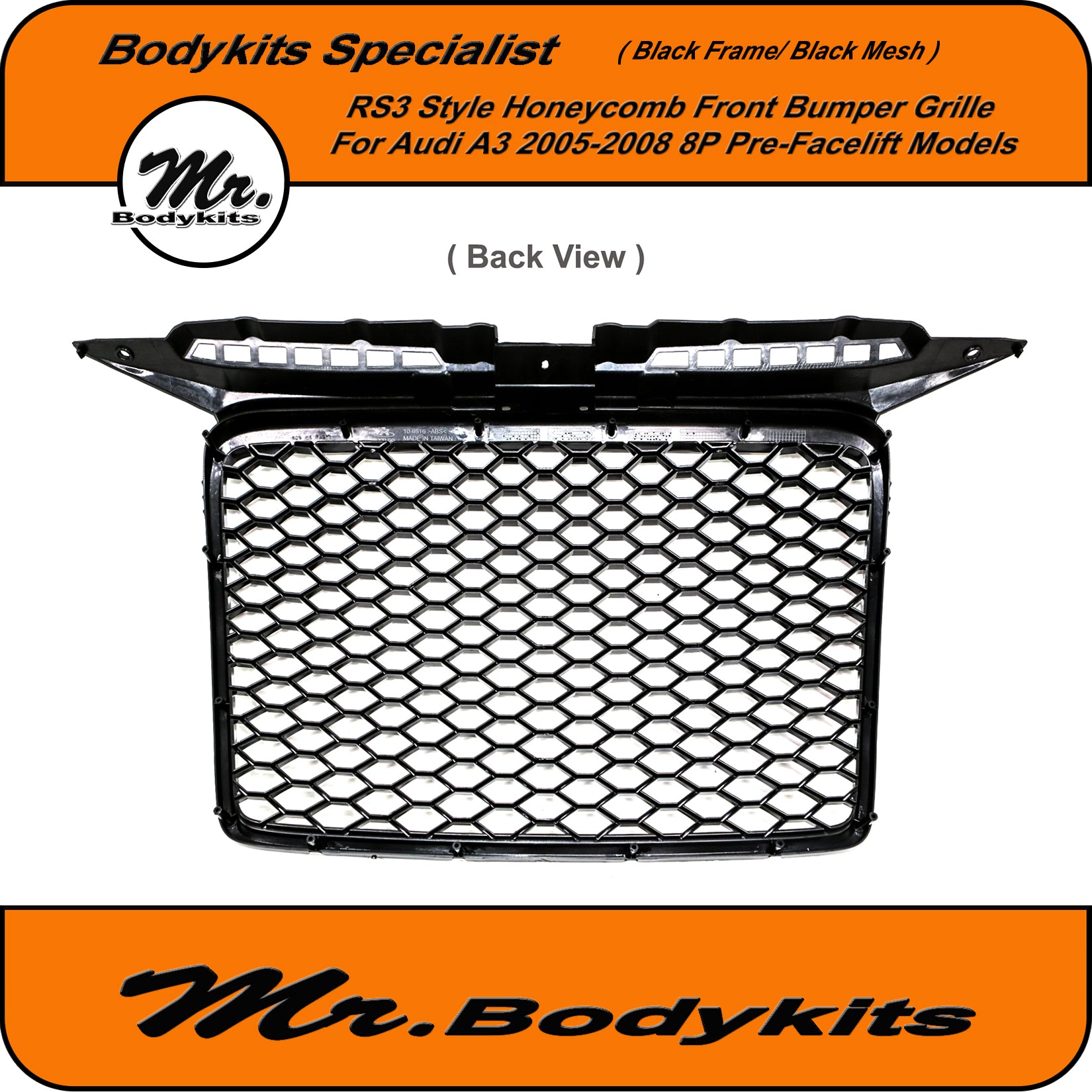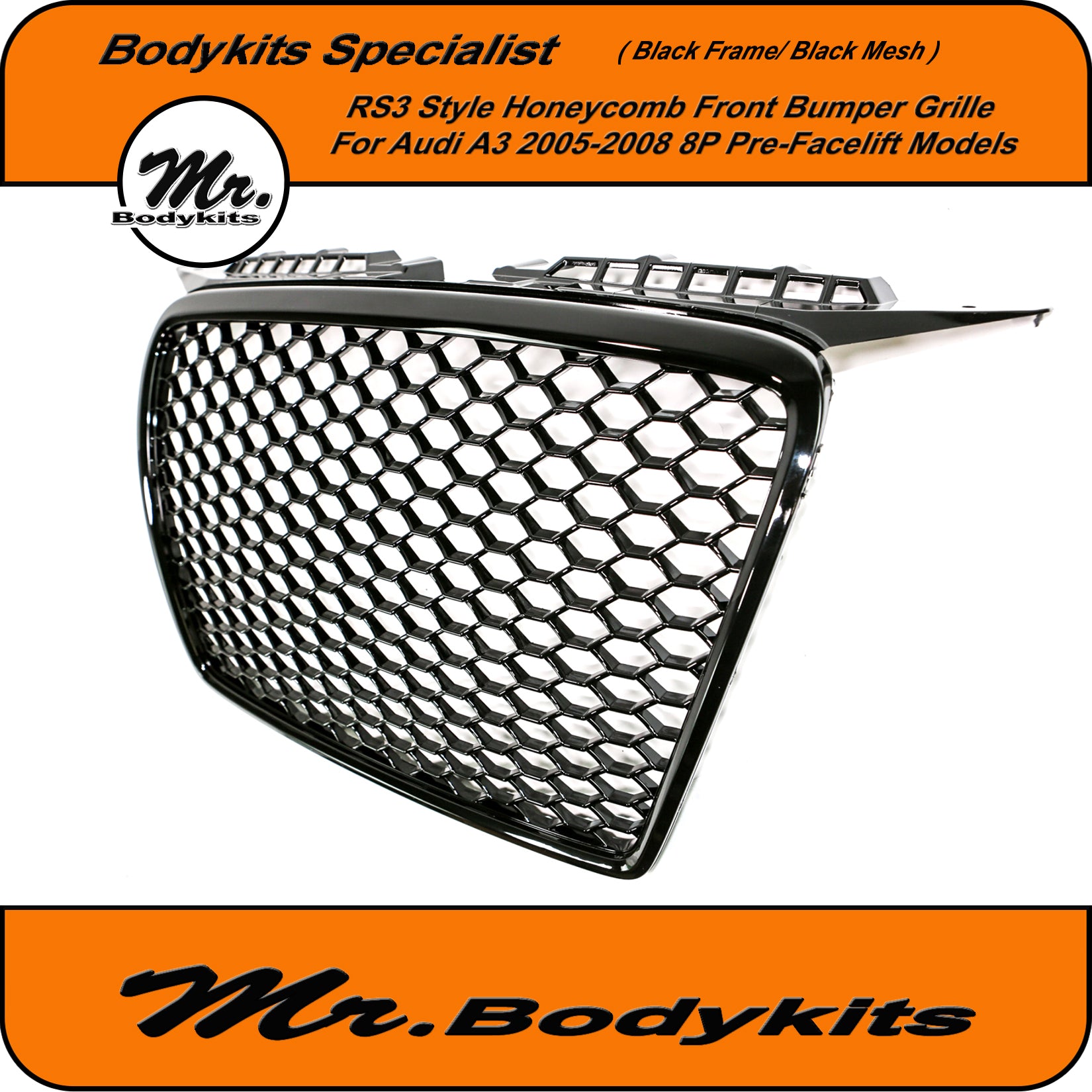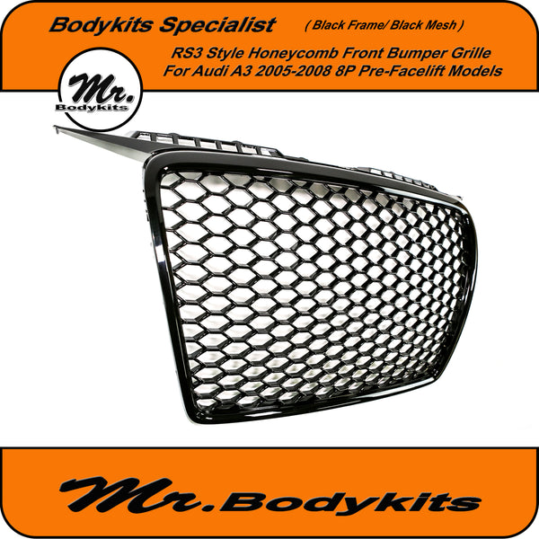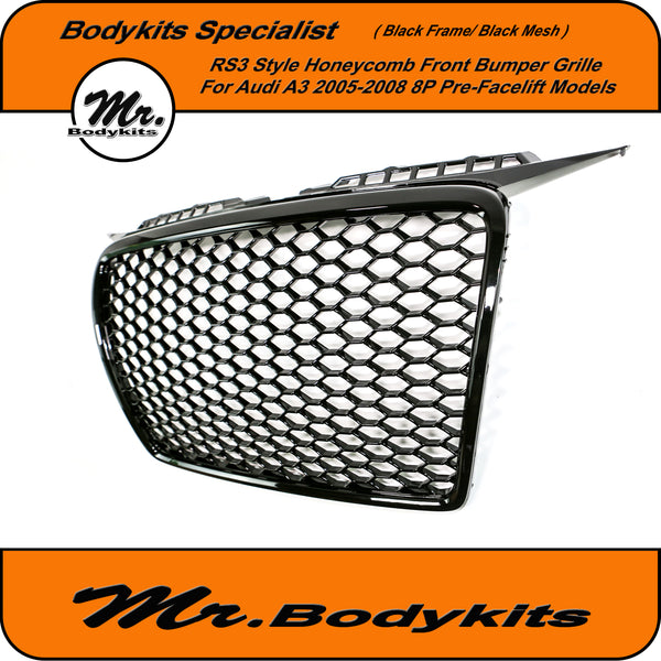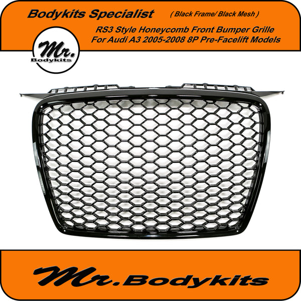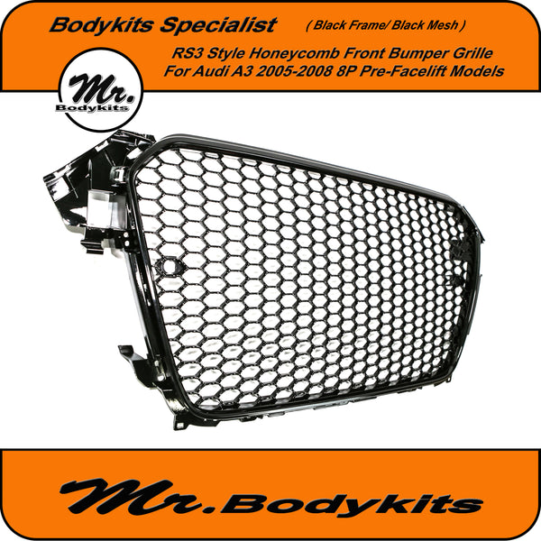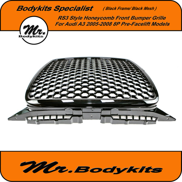 RS3 Style Front Bumper Grille, Gloss Black Surround With Gloss Honeycomb Mesh Grille For Audi A3 8P 2005-2008 Pre-Facelift.