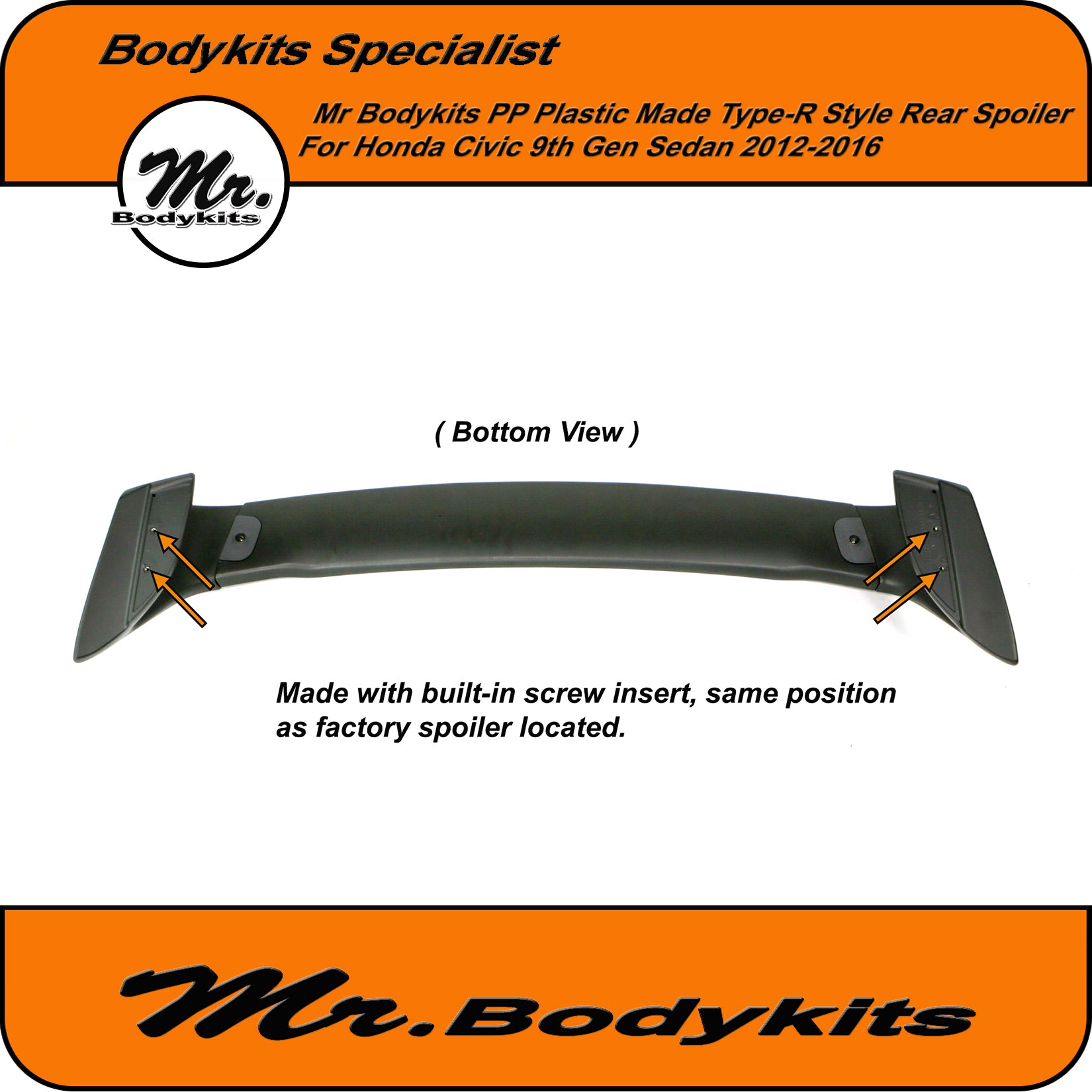 - Quality plastic made. 1:1 Type-R spoiler.