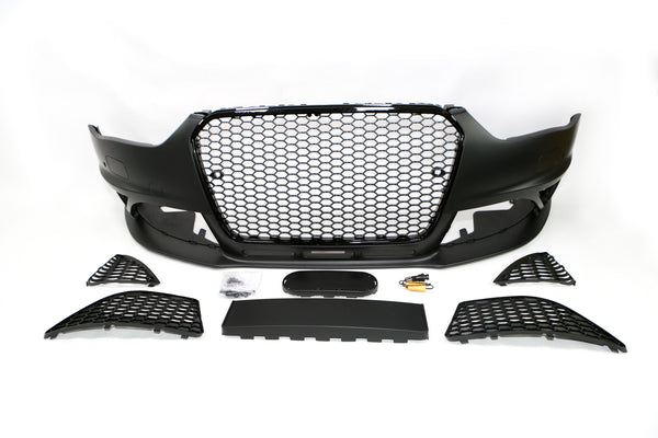 • Full front bumper set with gloss black honeycomb grille/ Audi badge base/ number plate support, centre and side mesh grille