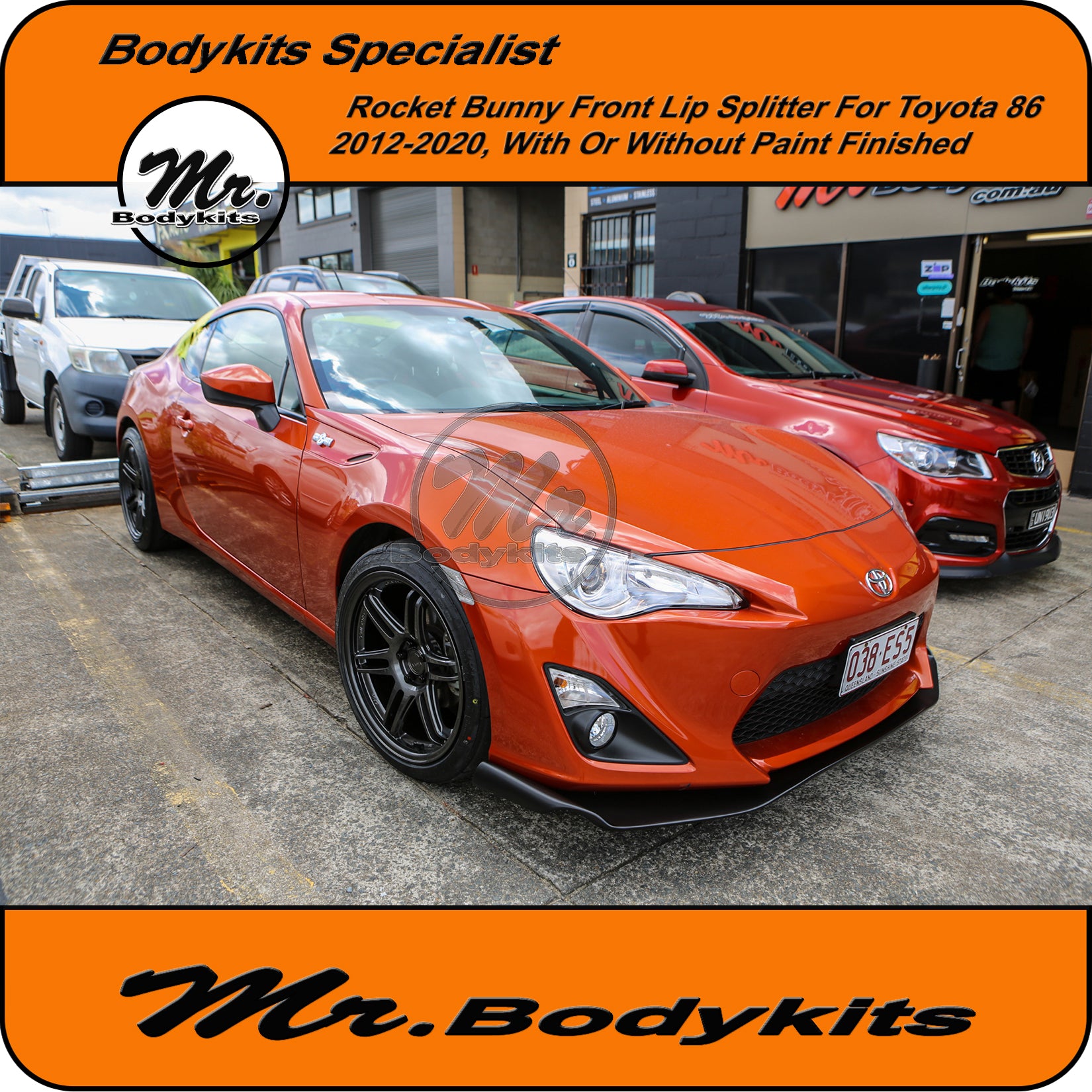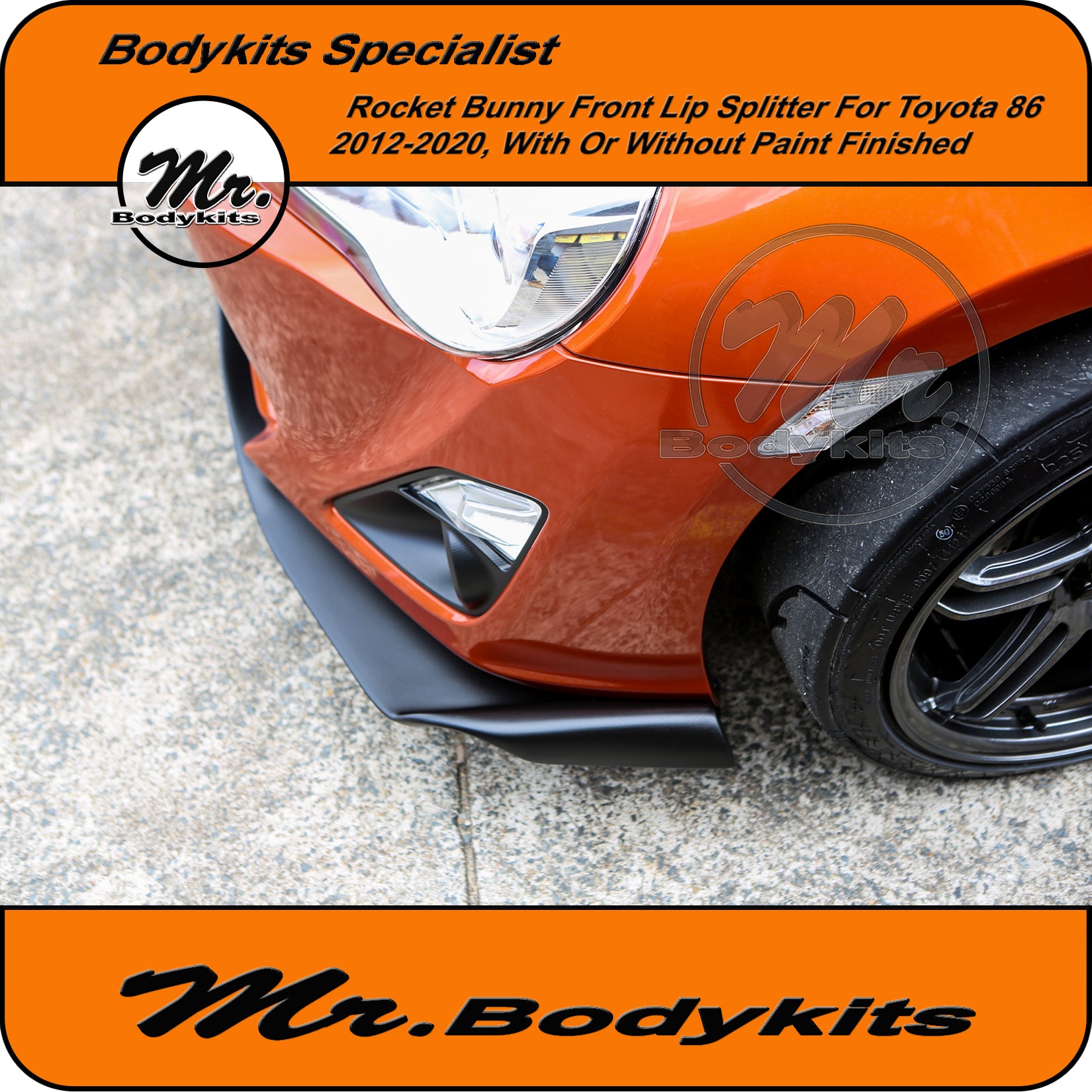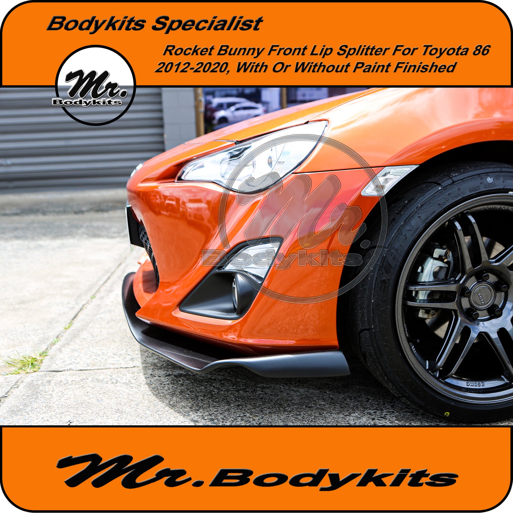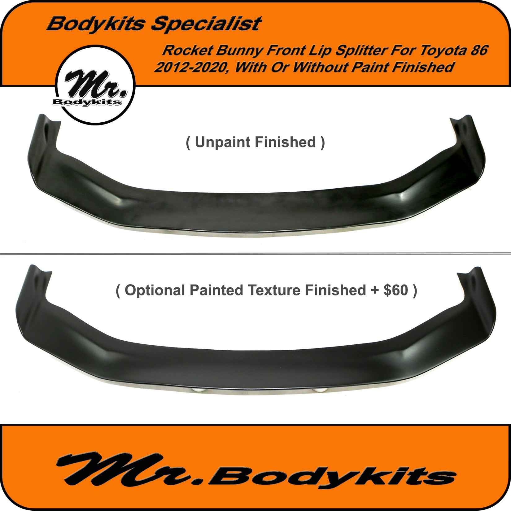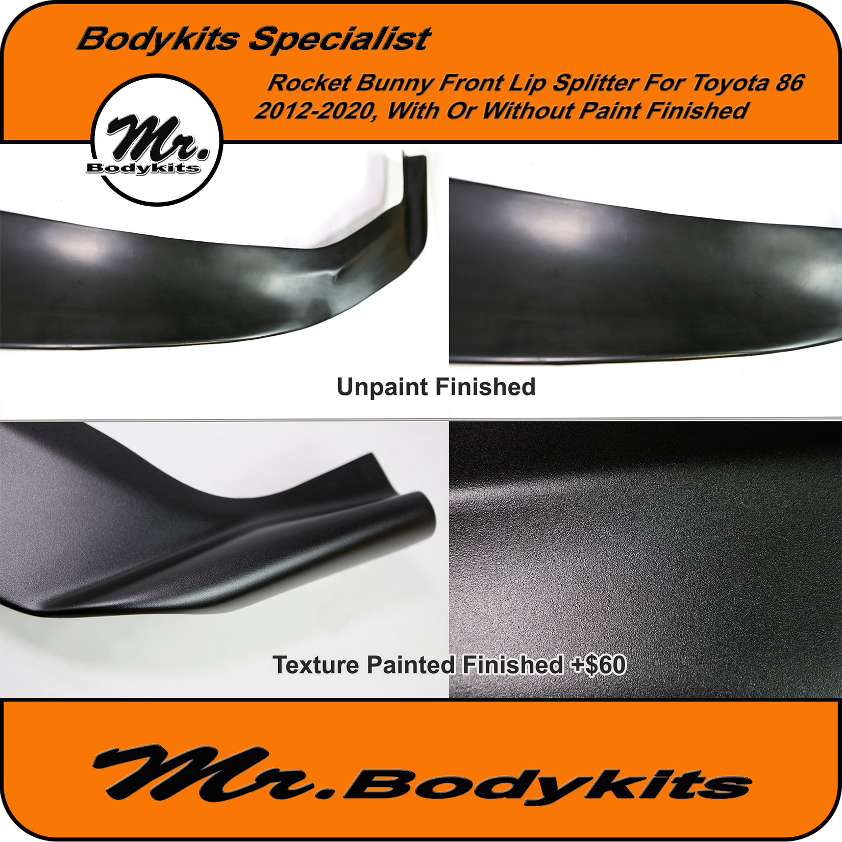 - The front lip is finished in raw unpainted plastic finished, you can colour-match it or we can offer an optional textured satin black for an extra $60. This light texture finish is painted with a proper 2K paint system, it matches well with any colour 86.